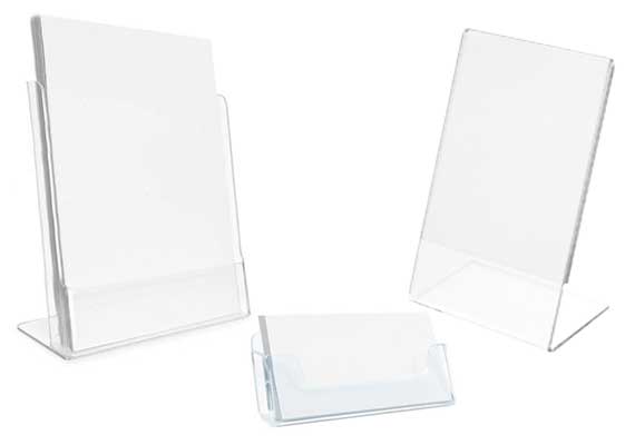 Porta volantini con vari formati in PVC trasparente o in cartonato.