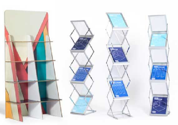 Varie soluzioni espositive per riviste, libri o oggetti in vari materiali.